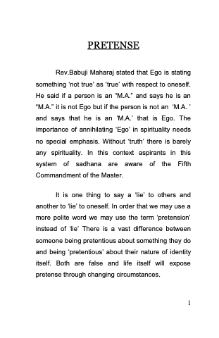 Rev.Babuji Maharaj stated that Ego is stating something ̳not true‘ as ̳true‘ with respect to oneself. He said if a person is an ―M.A.‖ and says he is an ―M.A.‖ it is not Ego but if the person is not an ̳M.A. ‘ and says that he is an ̳M.A.‘ that is Ego. The importance of annihilating ̳Ego‘ in spirituality needs no special emphasis. Without ̳truth‘ there is barely any spirituality. In this context aspirants in this system of sadhana are aware of the Fifth Commandment of the Master.