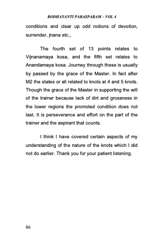 The fourth set of 13 points relates to Vijnanamaya kosa, and the fifth set relates to Anandamaya kosa. Journey through these is usually by passed by the grace of the Master. In fact after M2 the states or all related to knots at 4 and 5 knots. Though the grace of the Master in supporting the will of the trainer because lack of dirt and grossness in the lower regions the promoted condition does not last. It is perseverance and effort on the part of the trainer and the aspirant that counts.