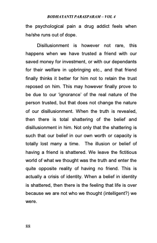 Disillusionment is however not rare, this happens when we have trusted a friend with our saved money for investment, or with our dependants for their welfare in upbringing etc., and that friend finally thinks it better for him not to retain the trust reposed on him. This may however finally prove to be due to our ̳ignorance‘ of the real nature of the person trusted, but that does not change the nature of our disillusionment. When the truth is revealed, then there is total shattering of the belief and disillusionment in him. Not only that the shattering is such that our belief in our own worth or capacity is totally lost many a time. The illusion or belief of having a friend is shattered. We leave the fictitious world of what we thought was the truth and enter the quite opposite reality of having no friend. This is actually a crisis of identity. When a belief in identity is shattered, then there is the feeling that life is over because we are not who we thought (intelligent?) we were.