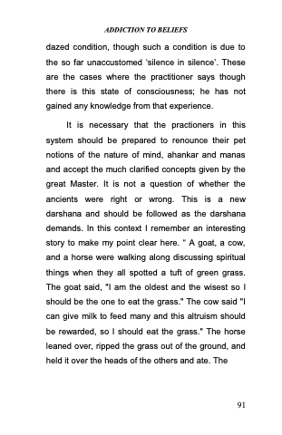 It is necessary that the practioners in this system should be prepared to renounce their pet notions of the nature of mind, ahankar and manas and accept the much clarified concepts given by the great Master. It is not a question of whether the ancients were right or wrong. This is a new darshana and should be followed as the darshana demands. In this context I remember an interesting story to make my point clear here. ― A goat, a cow, and a horse were walking along discussing spiritual things when they all spotted a tuft of green grass. The goat said, "I am the oldest and the wisest so I should be the one to eat the grass." The cow said "I can give milk to feed many and this altruism should be rewarded, so I should eat the grass." The horse leaned over, ripped the grass out of the ground, and held it over the heads of the others and ate. The