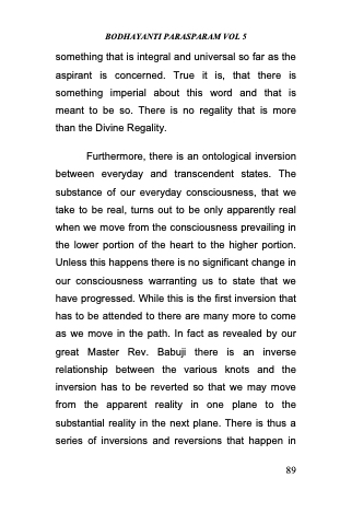 Furthermore, there is an ontological inversion between everyday and transcendent states. The substance of our everyday consciousness, that we take to be real, turns out to be only apparently real when we move from the consciousness prevailing in the lower portion of the heart to the higher portion. Unless this happens there is no significant change in our consciousness warranting us to state that we have progressed. While this is the first inversion that has to be attended to there are many more to come as we move in the path. In fact as revealed by our great Master Rev. Babuji there is an inverse relationship between the various knots and the inversion has to be reverted so that we may move from the apparent reality in one plane to the substantial reality in the next plane. There is thus a series of inversions and reversions that happen in