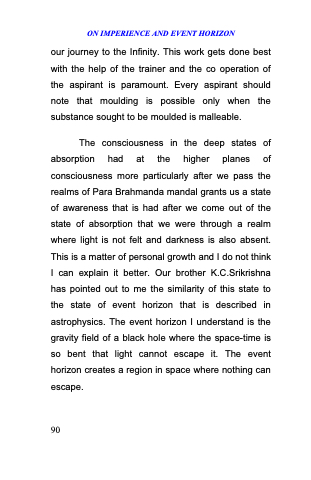 The consciousness in the deep states of absorption had at the higher planes of consciousness more particularly after we pass the realms of Para Brahmanda mandal grants us a state of awareness that is had after we come out of the state of absorption that we were through a realm where light is not felt and darkness is also absent. This is a matter of personal growth and I do not think I can explain it better. Our brother K.C.Srikrishna has pointed out to me the similarity of this state to the state of event horizon that is described in astrophysics. The event horizon I understand is the gravity field of a black hole where the space-time is so bent that light cannot escape it. The event horizon creates a region in space where nothing can escape.