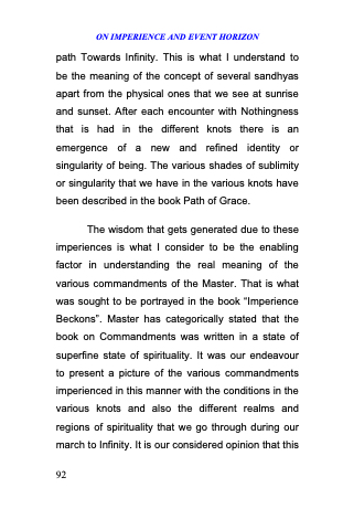 The wisdom that gets generated due to these imperiences is what I consider to be the enabling factor in understanding the real meaning of the various commandments of the Master. That is what was sought to be portrayed in the book ―Imperience Beckons‖. Master has categorically stated that the book on Commandments was written in a state of superfine state of spirituality. It was our endeavour to present a picture of the various commandments imperienced in this manner with the conditions in the various knots and also the different realms and regions of spirituality that we go through during our march to Infinity. It is our considered opinion that this