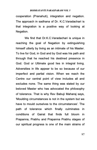 We find that Dr.K.C.Varadachari is unique in reaching the goal of Negation by extinguishing himself utterly by living as an intimate of his Master. To live for God, in God and by God was his path and through that he reached his destined presence in God. God or Ultimate good lies in integral living. Adversities in life appear to be so because of our imperfect and partial vision. When we reach the Centre our central point of view includes all and excludes none. The same thing was stated by our beloved Master who has advocated the philosophy of tolerance. That is why Rev Babuji Maharaj says, 'Moulding circumstances is not in the system but we have to mould ourselves to the circumstances'. The path of tolerance which finally culminates in conditions of Gairat that finds full bloom in Prapanna, Prabhu and Prapanna Prabhu stages of our spiritual progress is one of the main strains of