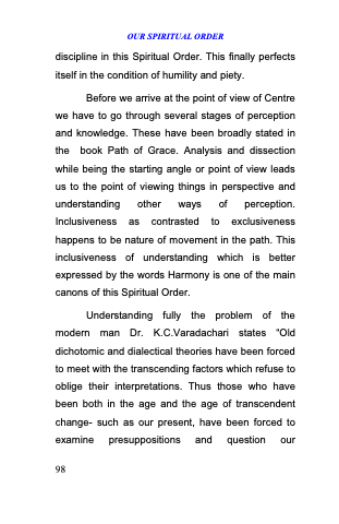 Before we arrive at the point of view of Centre we have to go through several stages of perception and knowledge. These have been broadly stated in the book Path of Grace. Analysis and dissection while being the starting angle or point of view leads us to the point of viewing things in perspective and understanding other ways of perception. Inclusiveness as contrasted to exclusiveness happens to be nature of movement in the path. This inclusiveness of understanding which is better expressed by the words Harmony is one of the main canons of this Spiritual Order.