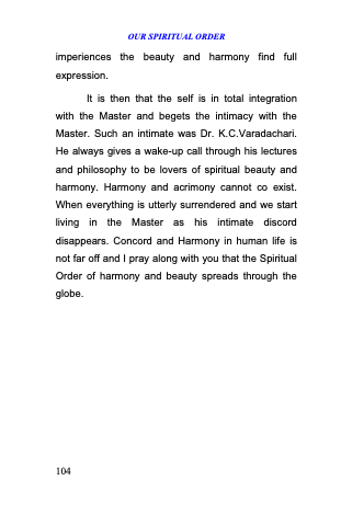 It is then that the self is in total integration with the Master and begets the intimacy with the Master. Such an intimate was Dr. K.C.Varadachari. He always gives a wake-up call through his lectures and philosophy to be lovers of spiritual beauty and harmony. Harmony and acrimony cannot co exist. When everything is utterly surrendered and we start living in the Master as his intimate discord disappears. Concord and Harmony in human life is not far off and I pray along with you that the Spiritual Order of harmony and beauty spreads through the globe.