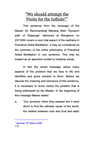 This sentence from the message of the Master Sri Ramchandraji Maharaj titled ―Dynamic path of Rajayoga― delivered at Bangalore on 23/12/64 covers a very vital aspect of the sadhana in Pranahuti Aided Meditation. It may be considered as the summary of the entire philosophy of Pranahuti Aided Meditation in one sentence. This may be treated as an aphorism similar to Vedanta sutras.