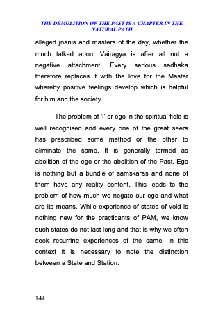 The problem of ̳I‘ or ego in the spiritual field is well recognised and every one of the great seers has prescribed some method or the other to eliminate the same. It is generally termed as abolition of the ego or the abolition of the Past. Ego is nothing but a bundle of samskaras and none of them have any reality content. This leads to the problem of how much we negate our ego and what are its means. While experience of states of void is nothing new for the practicants of PAM, we know such states do not last long and that is why we often seek recurring experiences of the same. In this context it is necessary to note the distinction between a State and Station.
