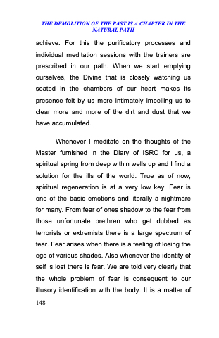achieve. For this the purificatory processes and individual meditation sessions with the trainers are prescribed in our path. When we start emptying ourselves, the Divine that is closely watching us seated in the chambers of our heart makes its presence felt by us more intimately impelling us to clear more and more of the dirt and dust that we have accumulated.