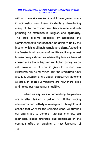 When we say we are demolishing the past we are in effect talking of getting rid off the binding samskaras and willfully choosing such thoughts and actions that work for the common good. All through our efforts are to demolish the self oriented, self restricted, closed universe and participate in the common effort of creating a new Universe of 150