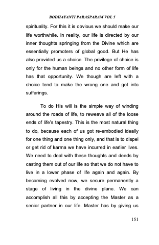 spirituality. For this it is obvious we should make our life worthwhile. In reality, our life is directed by our inner thoughts springing from the Divine which are essentially promoters of global good. But He has also provided us a choice. The privilege of choice is only for the human beings and no other form of life has that opportunity. We though are left with a choice tend to make the wrong one and get into sufferings.