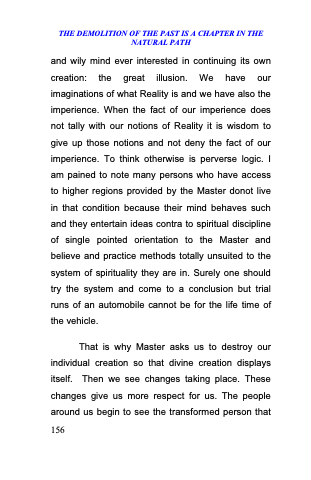 That is why Master asks us to destroy our individual creation so that divine creation displays itself. Then we see changes taking place. These changes give us more respect for us. The people around us begin to see the transformed person that 156