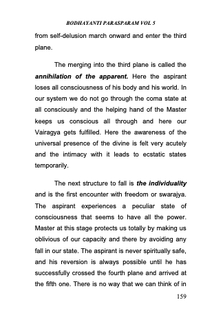 The next structure to fall is the individuality and is the first encounter with freedom or swarajya. The aspirant experiences a peculiar state of consciousness that seems to have all the power. Master at this stage protects us totally by making us oblivious of our capacity and there by avoiding any fall in our state. The aspirant is never spiritually safe, and his reversion is always possible until he has successfully crossed the fourth plane and arrived at the fifth one. There is no way that we can think of in