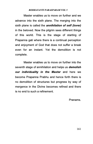 Master enables us to move on further into the seventh stage of annihilation and helps us demolish our individuality in the Master and here we become Prapanna Prabhu and hence forth there is no demolition of structures but progress by way of mergence in the Divine becomes refined and there is no end to such a refinement.