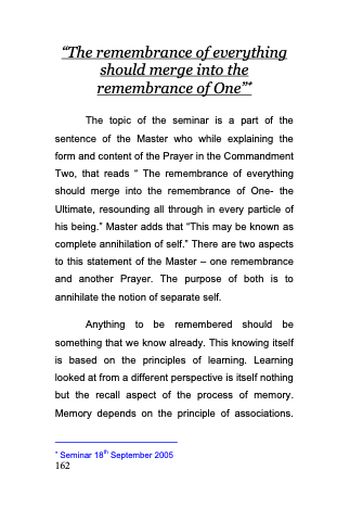 The topic of the seminar is a part of the sentence of the Master who while explaining the form and content of the Prayer in the Commandment Two, that reads ― The remembrance of everything should merge into the remembrance of One- the Ultimate, resounding all through in every particle of his being.‖ Master adds that ―This may be known as complete annihilation of self.‖ There are two aspects to this statement of the Master – one remembrance and another Prayer. The purpose of both is to annihilate the notion of separate self.
