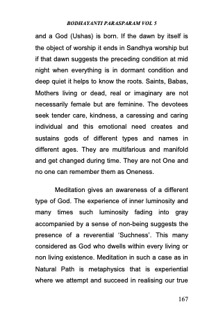 and a God (Ushas) is born. If the dawn by itself is the object of worship it ends in Sandhya worship but if that dawn suggests the preceding condition at mid night when everything is in dormant condition and deep quiet it helps to know the roots. Saints, Babas, Mothers living or dead, real or imaginary are not necessarily female but are feminine. The devotees seek tender care, kindness, a caressing and caring individual and this emotional need creates and sustains gods of different types and names in different ages. They are multifarious and manifold and get changed during time. They are not One and no one can remember them as Oneness.