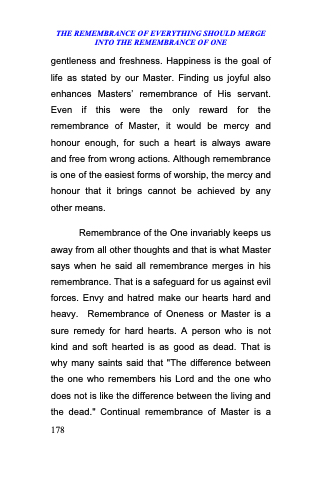 Remembrance of the One invariably keeps us away from all other thoughts and that is what Master says when he said all remembrance merges in his remembrance. That is a safeguard for us against evil forces. Envy and hatred make our hearts hard and heavy. Remembrance of Oneness or Master is a sure remedy for hard hearts. A person who is not kind and soft hearted is as good as dead. That is why many saints said that "The difference between the one who remembers his Lord and the one who does not is like the difference between the living and the dead." Continual remembrance of Master is a 178