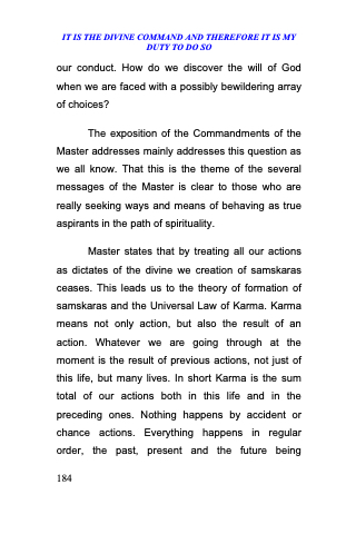 Master states that by treating all our actions as dictates of the divine we creation of samskaras ceases. This leads us to the theory of formation of samskaras and the Universal Law of Karma. Karma means not only action, but also the result of an action. Whatever we are going through at the moment is the result of previous actions, not just of this life, but many lives. In short Karma is the sum total of our actions both in this life and in the preceding ones. Nothing happens by accident or chance actions. Everything happens in regular order, the past, present and the future being