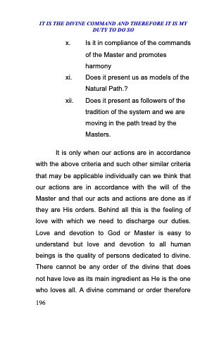 It is only when our actions are in accordance with the above criteria and such other similar criteria that may be applicable individually can we think that our actions are in accordance with the will of the Master and that our acts and actions are done as if they are His orders. Behind all this is the feeling of love with which we need to discharge our duties. Love and devotion to God or Master is easy to understand but love and devotion to all human beings is the quality of persons dedicated to divine. There cannot be any order of the divine that does not have love as its main ingredient as He is the one who loves all. A divine command or order therefore 196