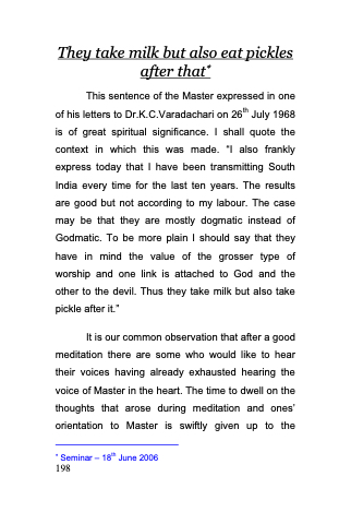 This sentence of the Master expressed in one of his letters to Dr.K.C.Varadachari on 26th July 1968 is of great spiritual significance. I shall quote the context in which this was made. ―I also frankly express today that I have been transmitting South India every time for the last ten years. The results are good but not according to my labour. The case may be that they are mostly dogmatic instead of Godmatic. To be more plain I should say that they have in mind the value of the grosser type of worship and one link is attached to God and the other to the devil. Thus they take milk but also take pickle after it.‖