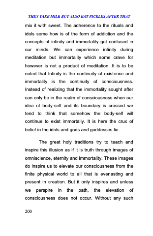 mix it with sweet. The adherence to the rituals and idols some how is of the form of addiction and the concepts of infinity and immortality get confused in our minds. We can experience infinity during meditation but immortality which some crave for however is not a product of meditation. It is to be noted that Infinity is the continuity of existence and immortality is the continuity of consciousness. Instead of realizing that the immortality sought after can only be in the realm of consciousness when our idea of body-self and its boundary is crossed we tend to think that somehow the body-self will continue to exist immortally. It is here the crux of belief in the idols and gods and goddesses lie.