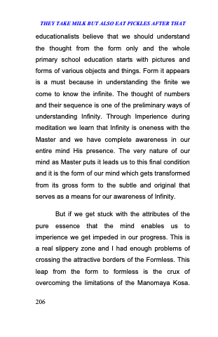 educationalists believe that we should understand the thought from the form only and the whole primary school education starts with pictures and forms of various objects and things. Form it appears is a must because in understanding the finite we come to know the infinite. The thought of numbers and their sequence is one of the preliminary ways of understanding Infinity. Through Imperience during meditation we learn that Infinity is oneness with the Master and we have complete awareness in our entire mind His presence. The very nature of our mind as Master puts it leads us to this final condition and it is the form of our mind which gets transformed from its gross form to the subtle and original that serves as a means for our awareness of Infinity.