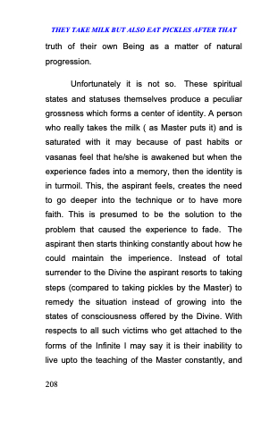 Unfortunately it is not so. These spiritual states and statuses themselves produce a peculiar grossness which forms a center of identity. A person who really takes the milk ( as Master puts it) and is saturated with it may because of past habits or vasanas feel that he/she is awakened but when the experience fades into a memory, then the identity is in turmoil. This, the aspirant feels, creates the need to go deeper into the technique or to have more faith. This is presumed to be the solution to the problem that caused the experience to fade. The aspirant then starts thinking constantly about how he could maintain the imperience. Instead of total surrender to the Divine the aspirant resorts to taking steps (compared to taking pickles by the Master) to remedy the situation instead of growing into the states of consciousness offered by the Divine. With respects to all such victims who get attached to the forms of the Infinite I may say it is their inability to live upto the teaching of the Master constantly, and
