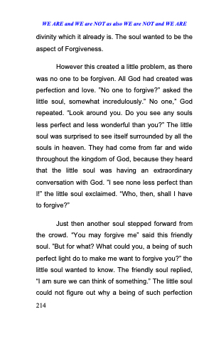 Just then another soul stepped forward from the crowd. ―You may forgive me‖ said this friendly soul. ‖But for what? What could you, a being of such perfect light do to make me want to forgive you?‖ the little soul wanted to know. The friendly soul replied, ―I am sure we can think of something.‖ The little soul could not figure out why a being of such perfection 214