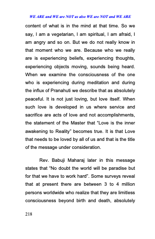 content of what is in the mind at that time. So we say, I am a vegetarian, I am spiritual, I am afraid, I am angry and so on. But we do not really know in that moment who we are. Because who we really are is experiencing beliefs, experiencing thoughts, experiencing objects moving, sounds being heard. When we examine the consciousness of the one who is experiencing during meditation and during the influx of Pranahuti we describe that as absolutely peaceful. It is not just loving, but love itself. When such love is developed in us where service and sacrifice are acts of love and not accomplishments, the statement of the Master that ―Love is the inner awakening to Reality‖ becomes true. It is that Love that needs to be loved by all of us and that is the title of the message under consideration.