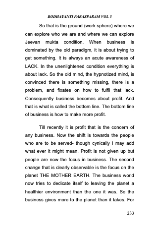 So that is the ground (work sphere) where we can explore who we are and where we can explore Jeevan mukta condition. When business is dominated by the old paradigm, it is about trying to get something. It is always an acute awareness of LACK. In the unenlightened condition everything is about lack. So the old mind, the hypnotized mind, is convinced there is something missing, there is a problem, and fixates on how to fulfil that lack. Consequently business becomes about profit. And that is what is called the bottom line. The bottom line of business is how to make more profit.