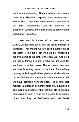 spiritual understanding. Oriental religions and more particularly Hinduism express such translucence. This is where religion becomes what it is intended to be. Such translucence can be observed in Buddhism, Jainism, and Sikhism and to some extent in Sufism in Islam too.