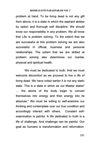 We must be dedicated to truth. And we must welcome discomfort as we proceed to live a life of living dead. We have noted earlier it is not any static state. This is a state in which as our Master states‖ ... the atoms of the body begin to convert themselves into energy and then energy into its absolute.‖ We must be willing to self-examine our thinking and contemplate over our true condition and accordingly interact with others. Constant self- examination is painful. A life dedicated to truth is a life of challenge. And challenge can be painful. Our goal as humans is transformation and reformation.
