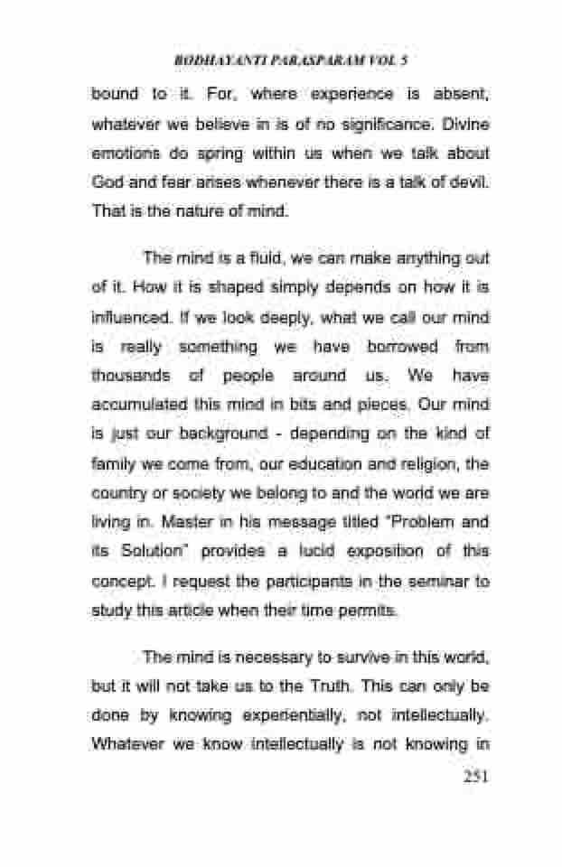 The mind is a fluid, we can make anything out of it. How it is shaped simply depends on how it is influenced. If we look deeply, what we call our mind is really something we have borrowed from thousands of people around us. We have accumulated this mind in bits and pieces. Our mind is just our background - depending on the kind of family we come from, our education and religion, the country or society we belong to and the world we are living in. Master in his message titled ―Problem and its Solution‖ provides a lucid exposition of this concept. I request the participants in the seminar to study this article when their time permits.