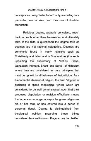 Religious dogma, properly conceived, reach back to proofs other than themselves, and ultimately faith. If the faith is questioned the dogma falls as dogmas are not rational categories. Dogmas are commonly found in many religions such as Christianity and Islam and in Shanmathas (the sects upholding the supremacy of Vishnu, Shiva, Ganapathi, Kumara, Shakti and Surya) of Hinduism where they are considered as core principles that must be upheld by all followers of that religion. As a fundamental element of religion, the term ―dogma‖ is assigned to those theological tenets which are considered to be well demonstrated, such that their proposed disputation or revision effectively means that a person no longer accepts the given religion as his or her own, or has entered into a period of personal doubt. Dogma is distinguished from theological opinion regarding those things considered less well-known. Dogma may be clarified