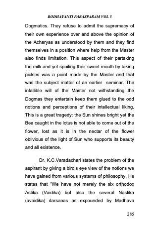 Dogmatics. They refuse to admit the supremacy of their own experience over and above the opinion of the Acharyas as understood by them and they find themselves in a position where help from the Master also finds limitation. This aspect of their partaking the milk and yet spoiling their sweet mouth by taking pickles was a point made by the Master and that was the subject matter of an earlier seminar. The infallible will of the Master not withstanding the Dogmas they entertain keep them glued to the odd notions and perceptions of their intellectual liking. This is a great tragedy: the Sun shines bright yet the Bea caught in the lotus is not able to come out of the flower, lost as it is in the nectar of the flower oblivious of the light of Sun who supports its beauty and all existence.