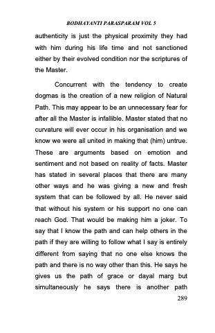 Concurrent with the tendency to create dogmas is the creation of a new religion of Natural Path. This may appear to be an unnecessary fear for after all the Master is infallible. Master stated that no curvature will ever occur in his organisation and we know we were all united in making that (him) untrue. These are arguments based on emotion and sentiment and not based on reality of facts. Master has stated in several places that there are many other ways and he was giving a new and fresh system that can be followed by all. He never said that without his system or his support no one can reach God. That would be making him a joker. To say that I know the path and can help others in the path if they are willing to follow what I say is entirely different from saying that no one else knows the path and there is no way other than this. He says he gives us the path of grace or dayal marg but simultaneously he says there is another path
