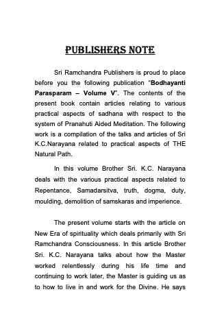 Sri Ramchandra Publishers is proud to place before you the following publication “Bodhayanti Parasparam – Volume V”. The contents of the present book contain articles relating to various practical aspects of sadhana with respect to the system of Pranahuti Aided Meditation. The following work is a compilation of the talks and articles of Sri K.C.Narayana related to practical aspects of THE Natural Path.