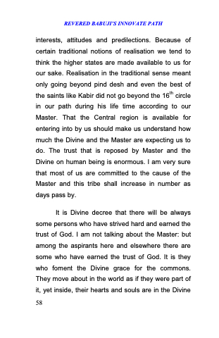 interests, attitudes and predilections. Because of certain traditional notions of realisation we tend to think the higher states are made available to us for our sake. Realisation in the traditional sense meant only going beyond pind desh and even the best of the saints like Kabir did not go beyond the 16th circle in our path during his life time according to our Master. That the Central region is available for entering into by us should make us understand how much the Divine and the Master are expecting us to do. The trust that is reposed by Master and the Divine on human being is enormous. I am very sure that most of us are committed to the cause of the Master and this tribe shall increase in number as days pass by.