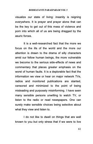 visualize our state of living: insanity is reigning everywhere. It is prayer and prayer alone that can be the key to get out of this mess of violence and porn into which all of us are being dragged by the asuric forces.