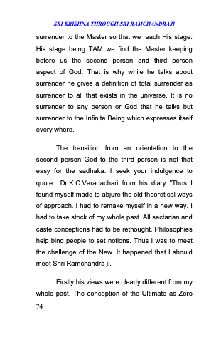 The transition from an orientation to the second person God to the third person is not that easy for the sadhaka. I seek your indulgence to quote Dr.K.C.Varadachari from his diary "Thus I found myself made to abjure the old theoretical ways of approach. I had to remake myself in a new way. I had to take stock of my whole past. All sectarian and caste conceptions had to be rethought. Philosophies help bind people to set notions. Thus I was to meet the challenge of the New. It happened that I should meet Shri Ramchandra ji.