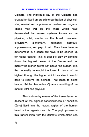 Ultimate. The individual ray of the Ultimate has created for itself an organic organization of physical- vital, mental and supramental centers and organs. These may well be the knots which have demarcated the several systems known as the physical, vital, mental or the bonal, muscular, circulatory, alimentary, hormonic, nervous, supranervous, and psychic etc. They have become autonomous in a sense but have to be opened up for higher control. This is possible only by bringing down the highest power of the Centre and not merely the higher power just above the human. It is the necessity to mould the lower in terms of the highest through the higher which has also to mould itself to receive the highest. That leads to going beyond Sri Aurobindonian Vijnana - moulding of the mental, vital and physical.