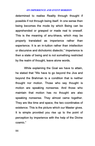 determined to realise Reality through thought if possible if not through being itself. In one sense then being becomes the mode by which Being can be apprehended or grasped or made real to oneself. This is the meaning of anu-bhava, which may be properly translated as imperience rather than experience. It is an in-tuition rather than intellection or discursive and dichotomic dialectic.‖ Imperience is then a state of being and is not something restricted by the realm of thought, leave alone words.