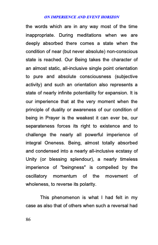 the words which are in any way most of the time inappropriate. During meditations when we are deeply absorbed there comes a state when the condition of near (but never absolute) non-conscious state is reached. Our Being takes the character of an almost static, all-inclusive single point orientation to pure and absolute consciousness (subjective activity) and such an orientation also represents a state of nearly infinite potentiality for expansion. It is our imperience that at the very moment when the principle of duality or awareness of our condition of being in Prayer is the weakest it can ever be, our separateness forces its right to existence and to challenge the nearly all powerful imperience of integral Oneness. Being, almost totally absorbed and condensed into a nearly all-inclusive ecstasy of Unity (or blessing splendour), a nearly timeless imperience of "beingness" is compelled by the oscillatory momentum of the movement of wholeness, to reverse its polarity.