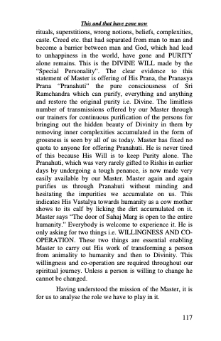 rituals, superstitions, wrong notions, beliefs, complexities, caste. Creed etc. that had separated from man to man and become a barrier between man and God, which had lead to unhappiness in the world, have gone and PURITY alone remains. This is the DIVINE WILL made by the “Special Personality”. The clear evidence to this statement of Master is offering of His Prana, the Pranasya Prana “Pranahuti” the pure consciousness of Sri Ramchandra which can purify, everything and anything and restore the original purity i.e. Divine. The limitless number of transmissions offered by our Master through our trainers for continuous purification of the persons for bringing out the hidden beauty of Divinity in them by removing inner complexities accumulated in the form of grossness is seen by all of us today. Master has fixed no quota to anyone for offering Pranahuti. He is never tired of this because His Will is to keep Purity alone. The Pranahuti, which was very rarely gifted to Rishis in earlier days by undergoing a tough penance, is now made very easily available by our Master. Master again and again purifies us through Pranahuti without minding and hesitating the impurities we accumulate on us. This indicates His Vastalya towards humanity as a cow mother shows to its calf by licking the dirt accumulated on it. Master says “The door of Sahaj Marg is open to the entire humanity.” Everybody is welcome to experience it. He is only asking for two things i.e. WILLINGNESS AND CO- OPERATION. These two things are essential enabling Master to carry out His work of transforming a person from animality to humanity and then to Divinity. This willingness and co-operation are required throughout our spiritual journey. Unless a person is willing to change he cannot be changed.