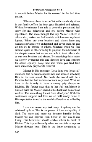 Love can make any task easy. Anything can be achieved by love. This is the power of love and quality of God. The more and more we become humble before Master we can express Him better in our day-to-day living. Our behaviour should enable others to think of Divine. This is possible only when we are able to express Master through love. This is the inner awakening to