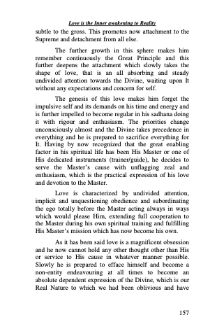 The further growth in this sphere makes him remember continuously the Great Principle and this further deepens the attachment which slowly takes the shape of love, that is an all absorbing and steady undivided attention towards the Divine, waiting upon It without any expectations and concern for self.