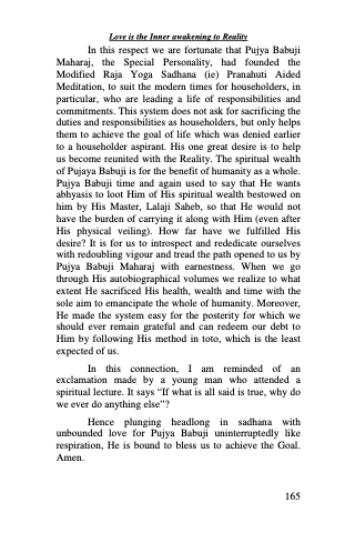 In this respect we are fortunate that Pujya Babuji Maharaj, the Special Personality, had founded the Modified Raja Yoga Sadhana (ie) Pranahuti Aided Meditation, to suit the modern times for householders, in particular, who are leading a life of responsibilities and commitments. This system does not ask for sacrificing the duties and responsibilities as householders, but only helps them to achieve the goal of life which was denied earlier to a householder aspirant. His one great desire is to help us become reunited with the Reality. The spiritual wealth of Pujaya Babuji is for the benefit of humanity as a whole. Pujya Babuji time and again used to say that He wants abhyasis to loot Him of His spiritual wealth bestowed on him by His Master, Lalaji Saheb, so that He would not have the burden of carrying it along with Him (even after His physical veiling). How far have we fulfilled His desire? It is for us to introspect and rededicate ourselves with redoubling vigour and tread the path opened to us by Pujya Babuji Maharaj with earnestness. When we go through His autobiographical volumes we realize to what extent He sacrificed His health, wealth and time with the sole aim to emancipate the whole of humanity. Moreover, He made the system easy for the posterity for which we should ever remain grateful and can redeem our debt to Him by following His method in toto, which is the least expected of us.