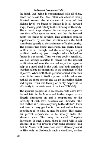 the ideal. Our being is contaminated with all these, hence far below the ideal. Thus our attention being directed towards the attainment of purity of that highest level, we began to imitate it in all outward ways, looking particularly to the cleaning of the body. The external ways adopted for the purpose began to cast their effect upon the mind and thus the internal purity too began to develop. This continued process supplemented by our firm attention upon the Ideal contributed greatly to the attainment of highest purity. The process thus being accelerated, real purity began to flow in all through, and the mind began to get purified, producing good thoughts which helped us further in our pursuit. Thus we were doubly benefited. We had already resorted to means for the internal purification and now the external ways too began to help us a good deal in the work, and both combined together helped us immensely in the attainment of the objective. When both these get harmonised with each other, it becomes in itself a power which makes our path all the more smooth and we go on soaring higher and higher. Thus our feeling of purity helped us so efficiently in the attainment of the ideal.”(TC-10)