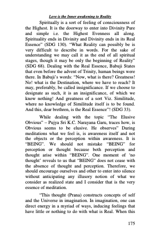 Spiritually is a sort of feeling of consciousness of the Highest. It is the doorway to enter into Divinity Pure and simple i.e. the Highest Evenness all along. Spirituality ends in Divinity and Divinity ends in its Real Essence” (SDG 130). “What Reality can possibly be is very difficult to describe in words. For the sake of understanding we may call it as the end of all spiritual stages, though it may be only the beginning of Reality” (SDG 68). Dealing with the Real Essence, Babuji States that even before the advent of Trinity, human beings were there. In Babuji’s words: “Now, what is there? Greatness! No! what is the Destination, where we have to reach? It may, preferably, be called insignificance. If we choose to designate as such, it is an insignificance, of which we know nothing! And greatness of a sort Viz. Similitude, where no knowledge of Similitude itself is to be found. And this, dear brethren, is the Real Essence”! (SDG 33).