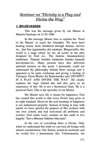 In this message Master tries to explain the ‘Need of the Master’ to reach the Almighty. We have been hearing stories from childhood through dramas, movies etc., that Eee jagamantha oka natakam, Bhagavatlila, this world is a stage where we are all actors in the play designed by God etc., The famous Annamacharya sankirtana ‘Naanati bratuku natakamu kanaka kannadi kaivalyamu’etc., Many persons have also delivered spiritual lectures on this point. I personally could not understand the philosophy behind these sayings and it appeared to be quite confusing and giving a feeling of Vairagya. Great Master Sri Ramchandra said ‘DIVINITY IS A PLA Y AND DIVINE THE W A Y’. He clearly explains the logic behind this and also gave us an experience of this. He is not a theoretical Guru. He is a practical Guru. This is the specialty of our Master.